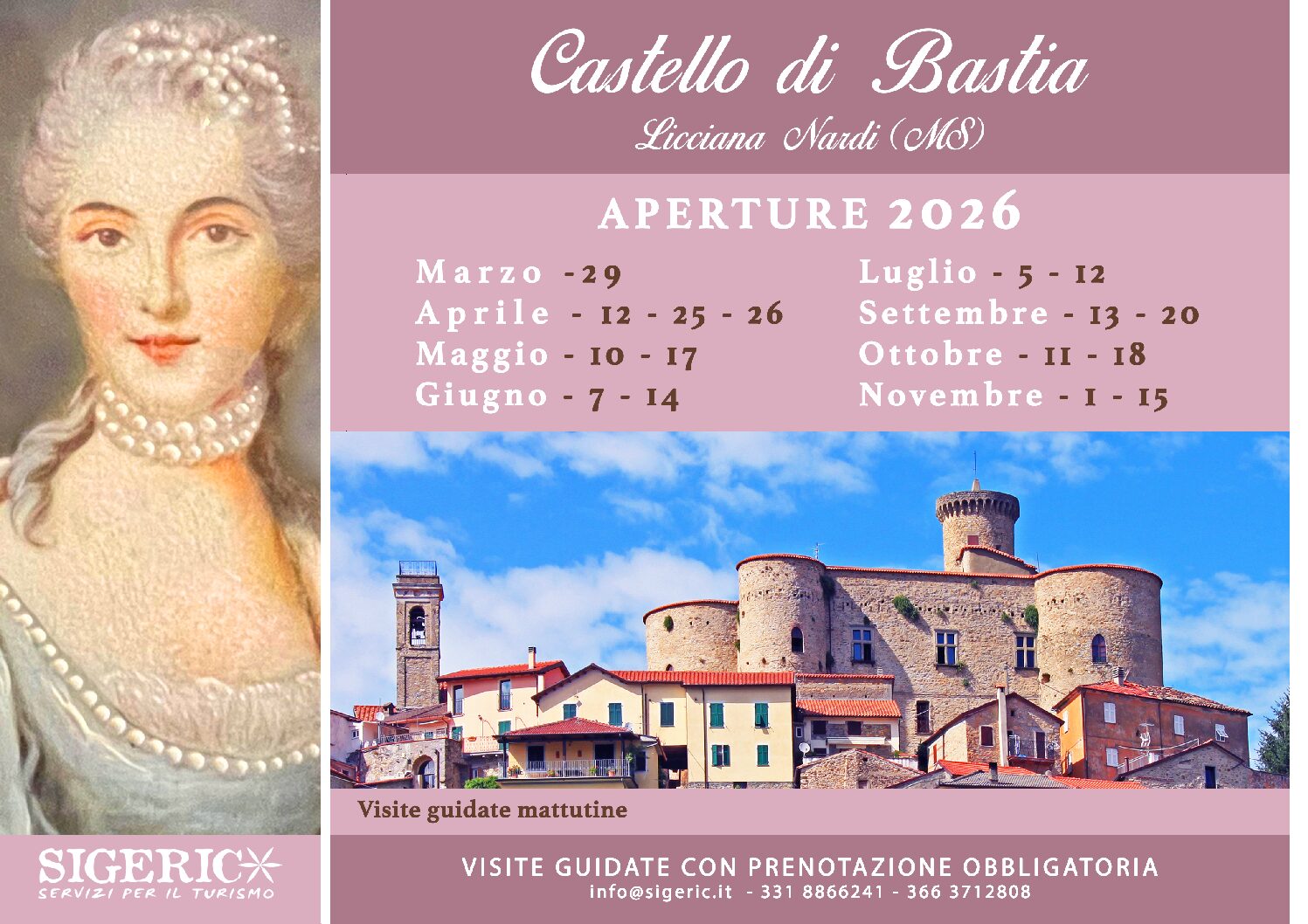 Le visite guidate hanno la durata di circa un’ora e si svolgono in date straordinarie da marzo a novembre. Tutte le visite sono a cura delle Guide della cooperativa di Comunità Sigeric – Servizi per il turismo, esperti del Turismo in Lunigiana.